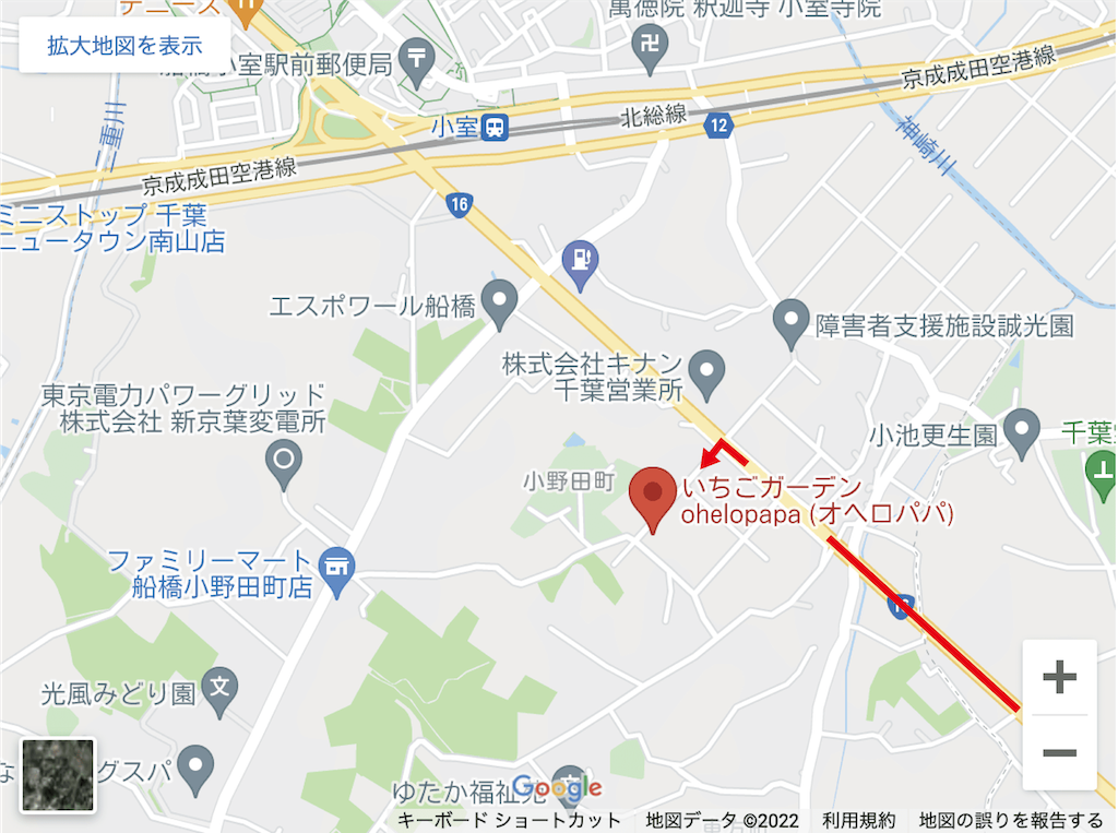 住所 住所:千葉県船橋市小野田町743電話番号:047-460-9122定休日:毎週月曜日メール:contact@ohelo-papa.com ・ルート案内はこちら↓https://goo.gl/maps/nSh5AhcNpEAnfQr89 電車・バスでお越しの場合 〇北総鉄道「小室駅」をご利用の場合船橋駅行き/北習志野駅行き/三咲駅行きの新京成バスに乗車し、「変電所」バス停下車。「小室駅」→「変電所」(約5分) 〇新京成電鉄線「三咲駅」/「北習志野駅」をご利用の場合小室駅行きの新京成バスに乗車し、「変電所」バス停下車。「三咲駅」→「変電所」(約10分) 〇JR総武線・東武野田線「船橋駅」をご利用の場合小室駅行きの新京成バスに乗車し、「変電所」バス停下車。「船橋駅北口」→「変電所」(約30分) ・「変電所」バス停からは徒歩約10分で到着致します。・「変電所」バス停下車後、ファミリーマートと下記「ルート2」の案内地図を参考にお越しください。 千葉八千代方面よりお越しの方 1. のぼり旗手前の道を左折2. 100メートル直進 柏・野田方面からお越しの方 1. 小室交差点から、左手にあるファミリーマート手前の道を左折し直進2. 船橋メモリアルパークを過ぎた先にある十字路を左折